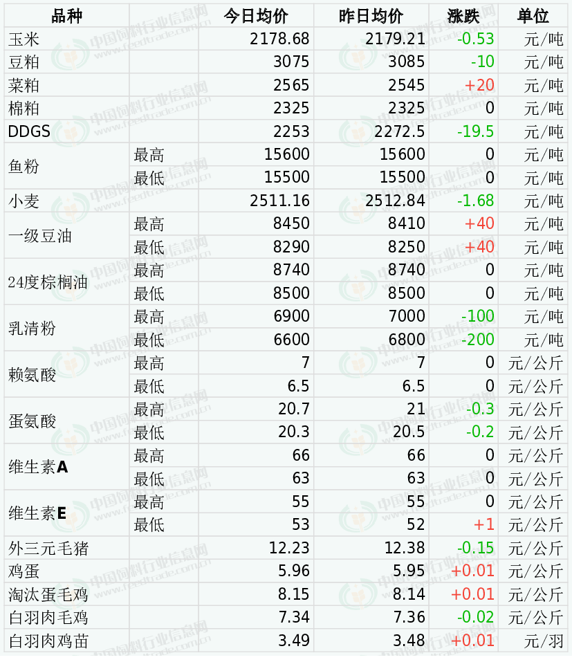 白羽肉毛鸡价格稳中偏弱。市场需求平稳,经销商补货积极性稍有下降,预计近期肉鸡价格窄幅震荡。今日主产区山东白羽肉毛鸡均价7.10元/公斤,较昨日价格下跌0.03;辽宁均价7.28元/公斤,较昨日价格下跌0.02;主销区江苏均价8.06元/公斤,较昨日价格下跌0.03。
