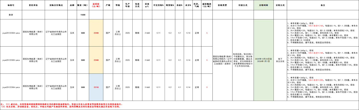 受国投生物能源(铁岭)有限公司委托,江苏粮油商品交易市场暨玉米分中心定于2025年12月23日 13:30 在“玉米分中心竞价采购交易专场”举办本次玉米竞价采购交易活动。具体事宜公告如下: