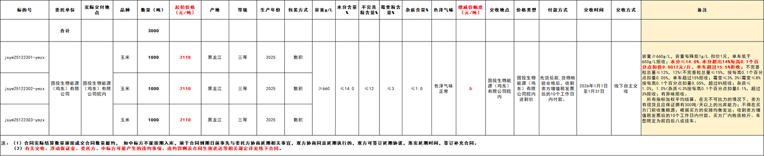 2.本次竞价采购交易起拍价:2110元/吨,竞价幅度为人民币5元/吨。交易价格类型为国投生物能源(鸡东)有限公司院内送到价。