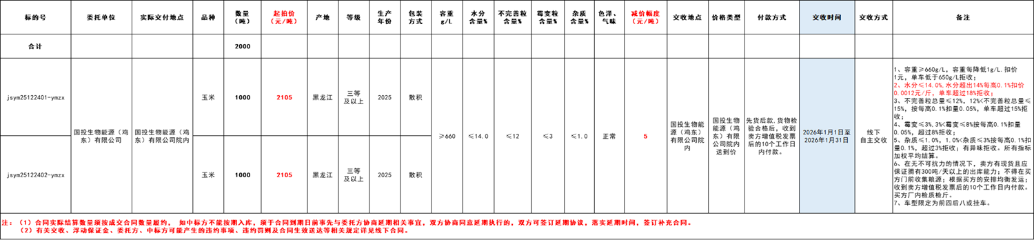 受国投生物能源(鸡东)有限公司委托,江苏粮油商品交易市场暨玉米分中心定于2025年12月24日 14:00在“玉米分中心竞价采购交易专场”举办本次玉米竞价采购交易活动。具体事宜公告如下: