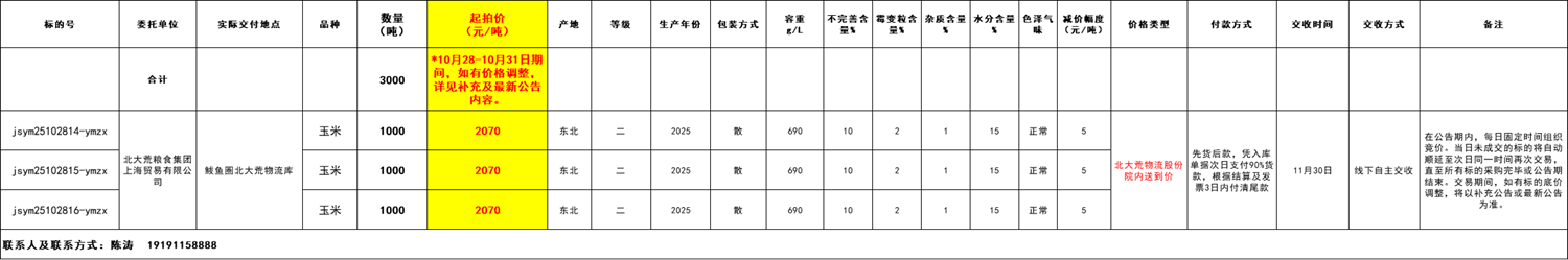 受北大荒粮食集团上海贸易有限公司委托,江苏粮油商品交易市场暨玉米分中心定于2025年10月28日至10月31日每日上午10:45,在“玉米分中心竞价采购交易专场”举办本次玉米循环采购交易活动。