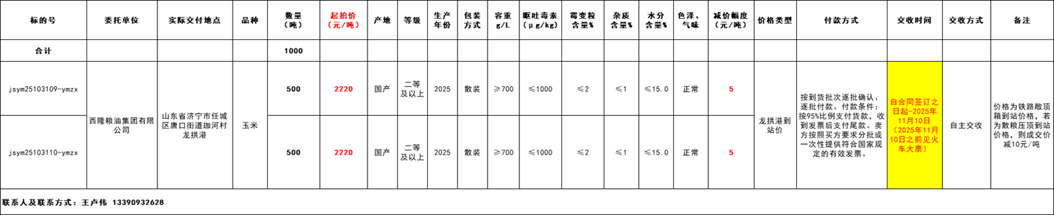 2.交收方式:自主交收,供货方凭盖章合同和身份证明提前联系委托方到库点交货,入库时间:自合同签订之日起-2025年11月10日(2025年11月10日之前见火车大票)。
