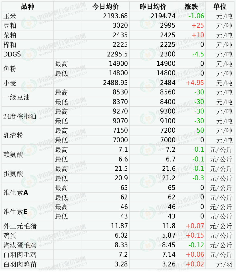 24日DDGS价格小跌。近期终端养殖需求欠佳,饲料企业多按需随用随采,采购积极性表现一般,且物流运输费用上涨,市场走货速度有所减慢,DDGS价格稳中偏弱。10月份原料玉米价格总体继续偏弱震荡走势为主,叠加其他强关联植物蛋白粕价格总体偏弱走势的影响,多方因素纠缠博弈,我们预判10月份期间大多数时候DDGS交易价格总体呈稳中偏弱震荡走势为主的可能性更大,10月份月度均价环比止涨转下跌的可能性更大。