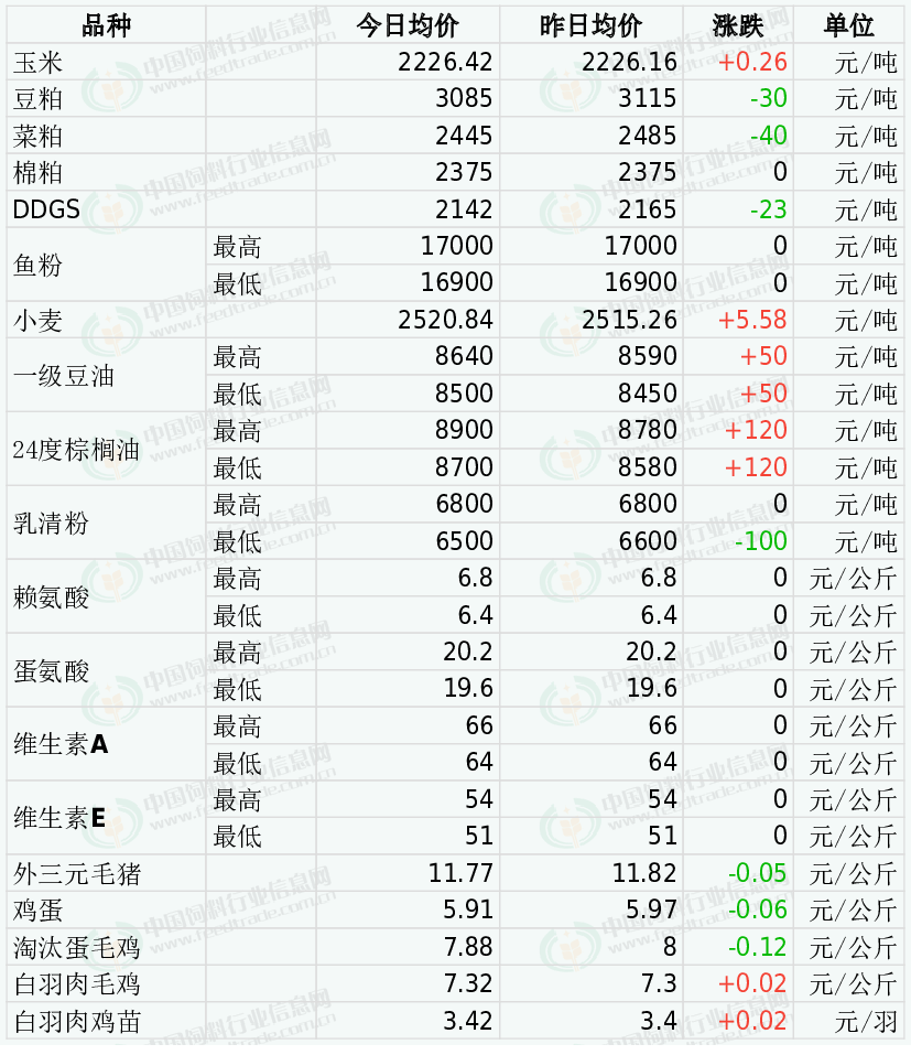 白羽肉毛鸡价格稳中有涨。鸡源紧缺阶段已结束,后期毛鸡呈现逐步增量趋势。分割品依旧维持前期的弱势姿态,产品议价成交,逐步下探,经销端拿货谨慎。屠企为稳定分割品价格会适度托底收购,对价格有一定支撑,预计短期内肉鸡价格窄幅震荡为主。今日主产区山东白羽肉毛鸡均价7.11元/公斤,较昨日价格上涨0.01;辽宁均价7.38元/公斤,较昨日价格上涨0.04;主销区江苏均价7.88元/公斤,较昨日价格上涨0.03。