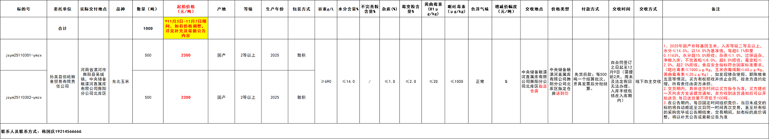 2.本次竞价采购交易起拍价2300元/吨,竞拍减价幅度为人民币5元/吨。交易价格类型为中央储备粮漯河直属库有限公司舞阳分公司北库区指定仓房送到价。