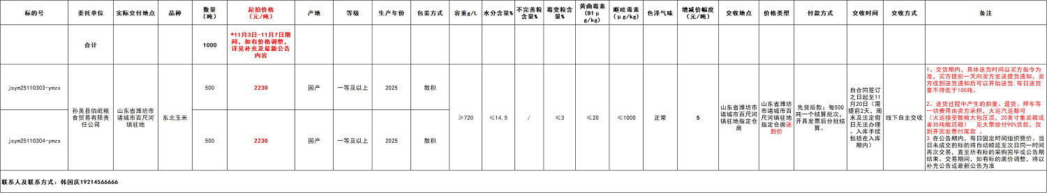 2.本次竞价采购交易起拍价2230元/吨,竞拍减价幅度为人民币5元/吨。交易价格类型为山东省潍坊市诸城市百尺河镇驻地指定仓房送到价。
