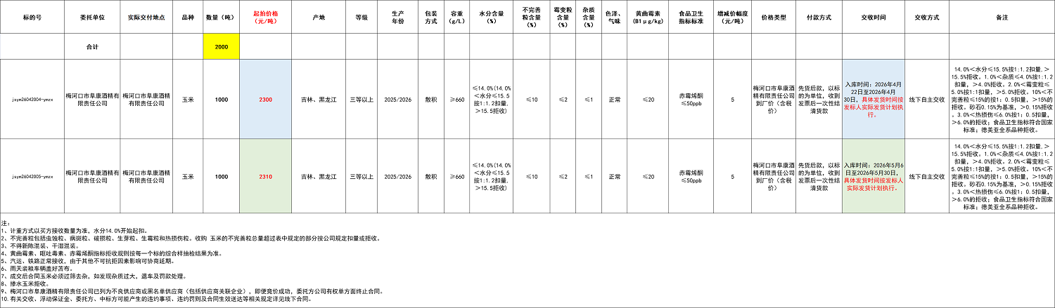 受梅河口市阜康酒精有限责任公司委托,江苏粮油商品交易市场暨玉米分中心定于2026年4月20日14:50在“玉米分中心竞价采购交易专场”举办本次玉米竞价采购交易活动。具体事宜公告如下: