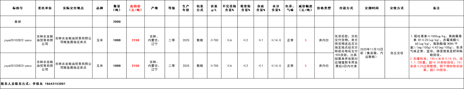 2.本次竞价采购交易起拍价:2150元/吨,竞拍减价幅度为人民币5元/吨。交易价格类型为吉林农发粮油贸易有限公司鲅鱼圈指定库点库内价。
