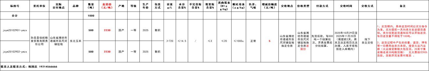 2.本次竞价采购交易起拍价2230元/吨,竞拍减价幅度为人民币5元/吨。交易价格类型为山东省潍坊市诸城市百尺河镇驻地指定仓房送到价。