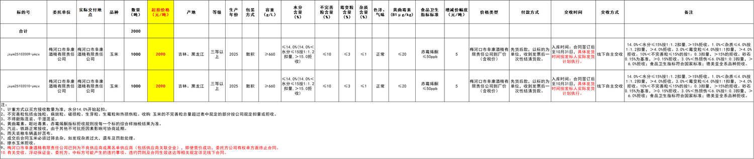 受梅河口市阜康酒精有限责任公司委托,江苏粮油商品交易市场暨玉米分中心定于2025年10月20日15:00在“玉米分中心竞价采购交易专场”举办本次玉米竞价采购交易活动。具体事宜公告如下: